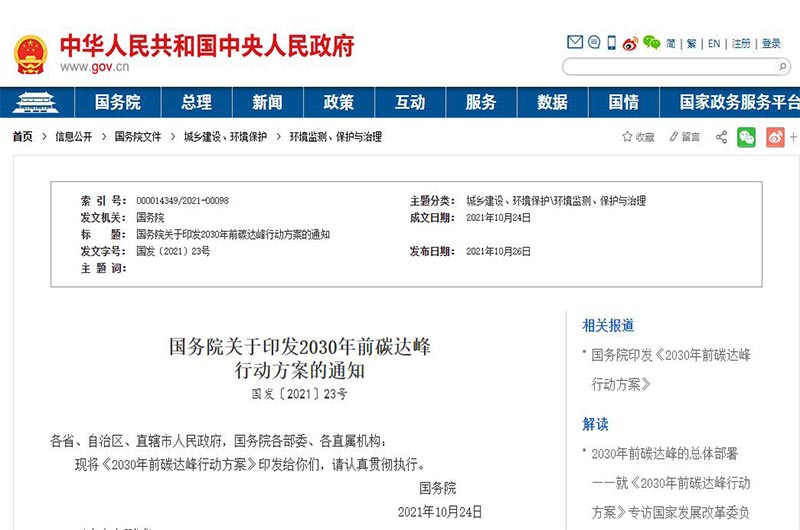 2021年10月24日,國務(wù)院發(fā)布《2030年前碳達(dá)峰行動方案》(以下簡稱《方案》),原文指出: